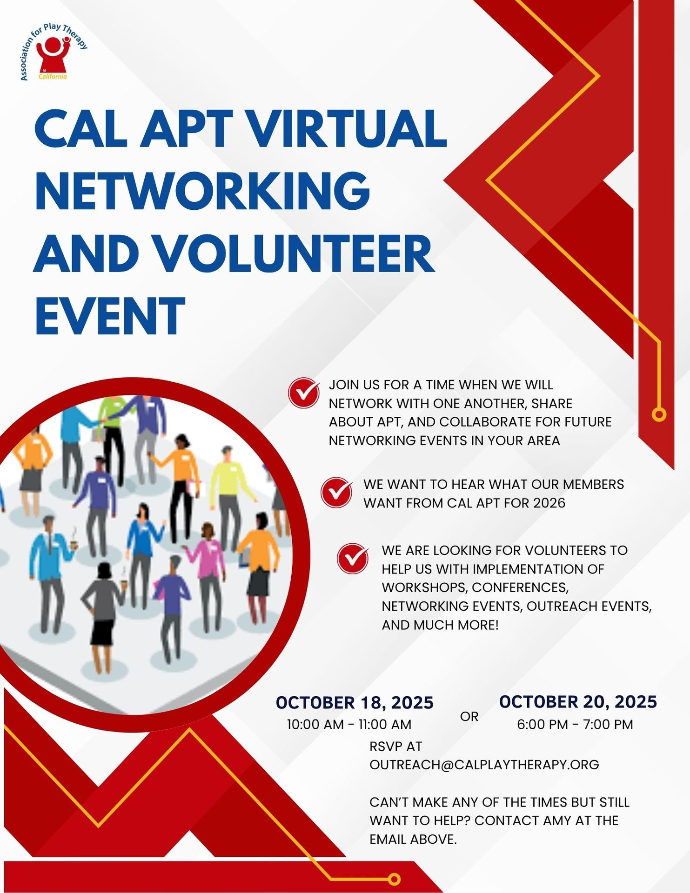 If you're interested in specific topics, have ideas and want to get involved, let us know! Have ideas for events, and ways to share about Play Therapy throughout California? Let's brainstorm together.